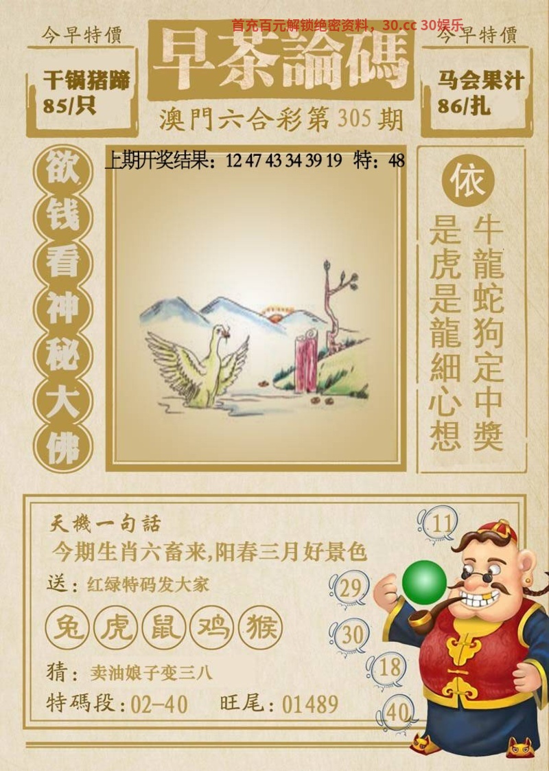 | 305期:早茶论码 解释:今期生肖六畜来,阳春三月好景色 综合9肖:羊鸡牛马鼠虎猪狗龙 越前越主,以上分析只代表个人理解,对错勿怪 |