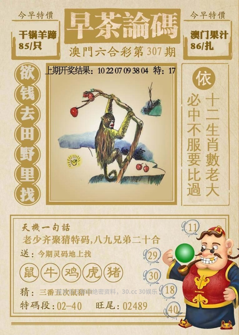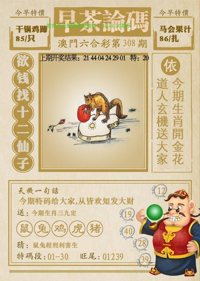 | 307期:早茶论码 解释:老少齐聚猜特码,八九兄弟二十合 综合9肖:牛猴蛇鼠虎猪龙狗羊 越前越主,以上分析只代表个人理解,对错勿怪 |